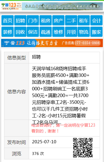 天润华城168烧烤招聘成手服务员底薪4500+满勤300+加酒水提成+储值提成工资6000+招聘刷碗工一名底薪3500元+满勤200=一共3700元招聘穿串工2名-3500元-也可以干几件工资招聘小时工-2名-小时15元招聘暑假工2名乌马河方向有寝室乌马河方向有通勤车有工作经验的来曹13845838882 【电话咨询时,请一定说明在伊春信息网看到的,谢谢!】 |