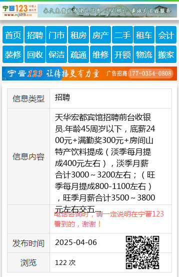 天华宏都宾馆招聘前台收银员.年龄45周岁以下,底薪2400元+满勤奖300元+房间山特产饮料提成(淡季每月提成400元左右),淡季月薪合计3000~3200左右;(旺季每月提成800-1100左右),旺季月薪合计3500~3800元左右交五险、工龄工资、提供员工食宿,有工作经验者优先。联系电话:18714782929耿女士耿经理18714782929 【电话咨询时,请一定说明在伊春信息网看到的,谢谢!】 |