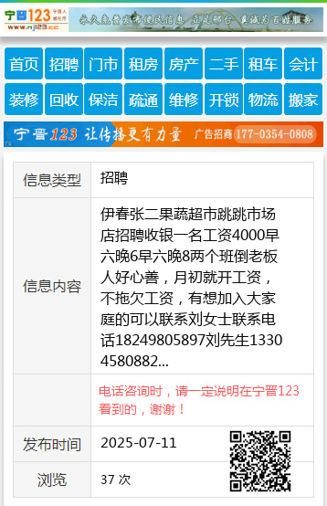 伊春张二果蔬超市跳跳市场店招聘收银一名工资4000早六晚6早六晚8两个班倒老板人好心善,月初就开工资,不拖欠工资,有想加入大家庭的可以联系刘女士联系电话18249805897刘先生13304580882