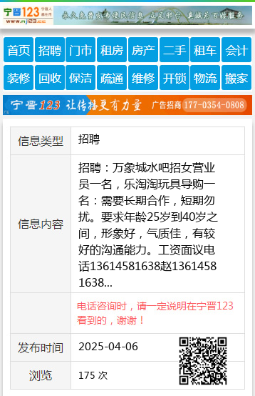 招聘:万象城水吧招女营业员一名,乐淘淘玩具导购一名:需要长期合作,短期勿扰。要求年龄25岁到40岁之间,形象好,气质佳,有较好的沟通能力。工资面议电话13614581638赵13614581638