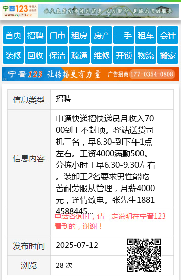 申通快递招快递员月收入7000到上不封顶。驿站送货司机三名,早6.30-到下午1点左右。工资4000满勤500。分拣小时工早6.30-9.30左右。装卸工2名要求男性能吃苦耐劳服从管理,月薪4000元,详情致电。张先生18814588445 【电话咨询时,请一定说明在伊春信息网看到的,谢谢!】 |