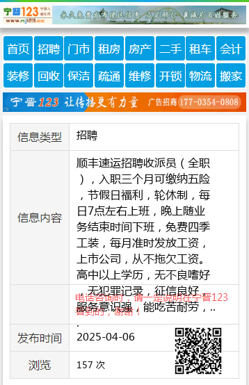 顺丰速运招聘收派员(全职),入职三个月可缴纳五险,节假日福利,轮休制,每日7点左右上班,晚上随业务结束时间下班,免费四季工装,每月准时发放工资,上市公司,从不拖欠工资。高中以上学历,无不良嗜好,无犯罪记录,征信良好,服务意识强,能吃苦耐劳,月工资4000以上,上不封顶,主要负责区域收派件工作,客户维护,业务开发,货款回收等。工作地点:伊美区联系方式:17614582005微信同步!程17614582005 【电话咨询时,请一定说明在伊春信息网看到的,谢谢!】 |