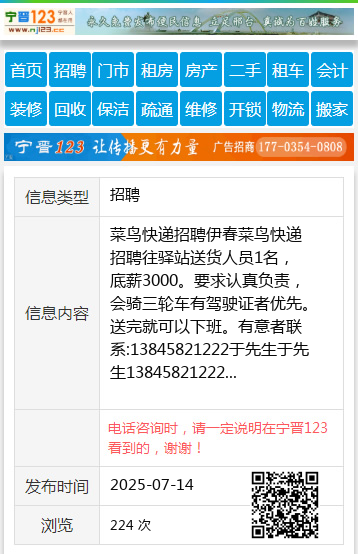 菜鸟快递招聘伊春菜鸟快递招聘往驿站送货人员1名,底薪3000。要求认真负责,会骑三轮车有驾驶证者优先。送完就可以下班。有意者联系:13845821222于先生于先生13845821222 【电话咨询时,请一定说明在伊春信息网看到的,谢谢!】 |