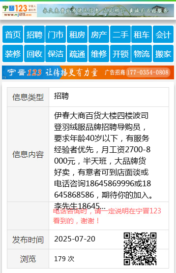伊春大商百货大楼四楼波司登羽绒服品牌招聘导购员,要求年龄40岁以下,有服务经验者优先,月工资2700-8000元,半天班,大品牌货好卖,有意者可到店面谈或电话咨询18645869996或18645868586,期待你的加入。李先生18645868586 【电话咨询时,请一定说明在伊春信息网看到的,谢谢!】 |