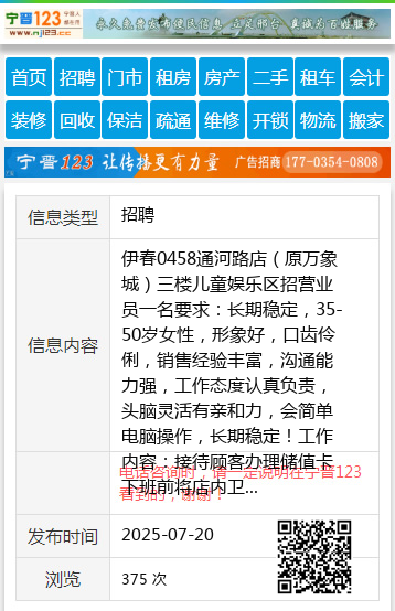 伊春0458通河路店(原万象城)三楼儿童娱乐区招营业员一名要求:长期稳定,35-50岁女性,形象好,口齿伶俐,销售经验丰富,沟通能力强,工作态度认真负责,头脑灵活有亲和力,会简单电脑操作,长期稳定!工作内容:接待顾客办理储值卡下班前将店内卫生收拾整洁,无顾客时可休息工作时间:9:00-19:00每月带薪休假两天,底薪+满勤+销售额提成,月收入3000—3500提成不封顶老板18945461516 |