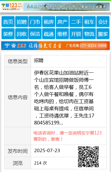 伊春区花果山加油站附近一个山庄宾馆招聘做饭师傅一名,给客人做早餐,员工6个人做午餐和晚餐,偶尔有吃烤肉的,给切肉在工资基础上每桌有提成,住宿单间,工资待遇优厚,王先生17804585199 【电话咨询时,请一定说明在伊春信息网看到的,谢谢!】 |
