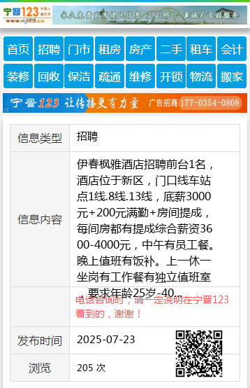 伊春枫雅酒店招聘前台1名,酒店位于新区,门口线车站点1线.8线.13线,底薪3000元+200元满勤+房间提成,每间房都有提成综合薪资3600-4000元,中午有员工餐。晚上值班有饭补。上一休一坐岗有工作餐有独立值班室,要求年龄25岁-40岁之间须有工作经验酒店老板事少联系电话13624587888微信同步徐经理13624587888 【电话咨询时,请一定说明在伊春信息网看到的,谢谢!】 |