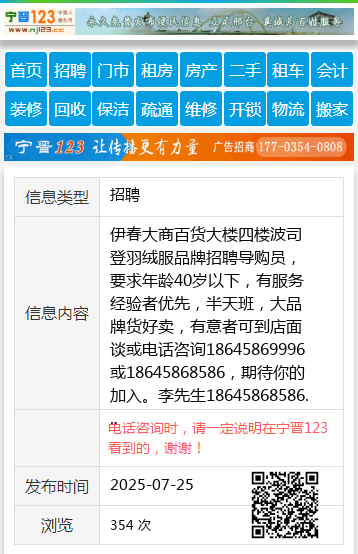 伊春大商百货大楼四楼波司登羽绒服品牌招聘导购员,要求年龄40岁以下,有服务经验者优先,半天班,大品牌货好卖,有意者可到店面谈或电话咨询18645869996或18645868586,期待你的加入。李先生18645868586 【电话咨询时,请一定说明在伊春信息网看到的,谢谢!】 |