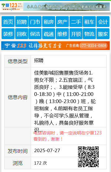 佳美影城招售票售货场务1.男女不限;2.五官端正,气质良好;、3.能接受早(8:30-18:30)中(11:00-21:00)晚(13:00-23:00)班,轮班制度,4.前期有老员工指导,不会可学;5.服从管理,礼貌待人,具备良好服务意识。招聘清洁员,具体要求如下:年龄在50岁-60左右,身体健康咨询电话:19904588000李经理19904588000 【电话咨询时,请一定说明在伊春信息网看到的,谢谢!】 |