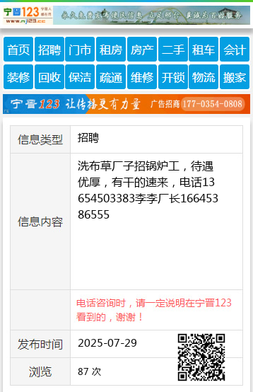 洗布草厂子招锅炉工,待遇优厚,有干的速来,电话13654503383李李厂长16645386555