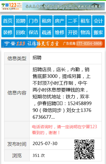 招聘店员,店长,内勤,销售底薪3000,提成另算,上不封顶7小时工作制,中午两小时休息想要赚钱的来,短期勿扰地址:铁力,双丰,伊春招聘☎️:15245889990(微信同步)刘女士13766736677 【电话咨询时,请一定说明在伊春信息网看到的,谢谢!】 |
