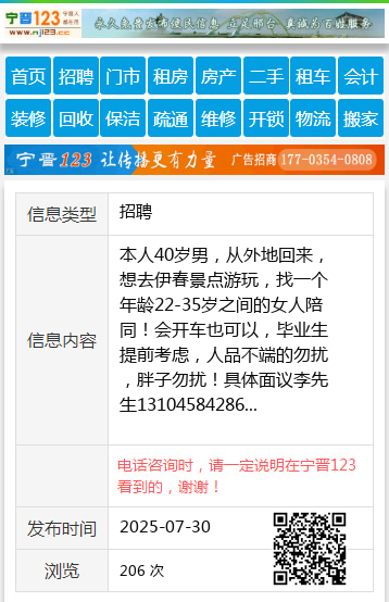 本人40岁男,从外地回来,想去伊春景点游玩,找一个年龄22-35岁之间的女人陪同!会开车也可以,毕业生提前考虑,人品不端的勿扰,胖子勿扰!具体面议李先生13104584286 【电话咨询时,请一定说明在伊春信息网看到的,谢谢!】 |
