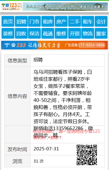 乌马河招聘看孩子保姆,白班或住家都行,照看2岁半女宝,做孩子2餐家常菜,不需要辅食。要求阿姨年龄40-50之间,干净利落,相貌和善,性格必须开朗,带孩子有耐心。月休4天。工资可谈,法定节假日多休。联络电话13359662286,微信同步。韩女士15246927654 【电话咨询时,请一定说明在伊春信息网看到的,谢谢!】 |