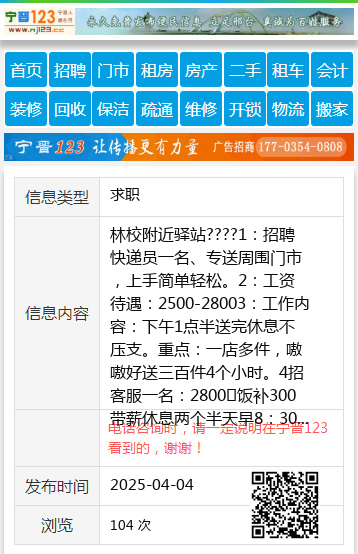 林校附近驿站????1:招聘快递员一名、专送周围门市,上手简单轻松。2:工资待遇:2500-28003:工作内容:下午1点半送完休息不压支。重点:一店多件,嗷嗷好送三百件4个小时。4招客服一名:2800➕饭补300带薪休息两个半天早8:30~到晚6点,日常驿站工作,无派件任务。5:有意者⬇️联系电话????刘先生16221073456刘先生13804853991 【电话咨询时,请一定说明在伊春信息网看到的,谢谢!】 |