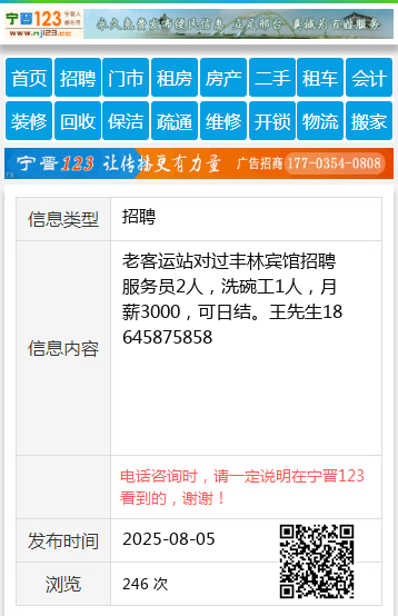 老客运站对过丰林宾馆招聘服务员2人,洗碗工1人,月薪3000,可日结。王先生18645875858