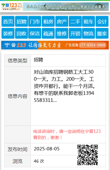 对山油库招聘钢筋工大工300一天。力工。200一天。工资咋开都行。能干一个月活。有想干的联系我郭老板13945583311 【电话咨询时,请一定说明在伊春信息网看到的,谢谢!】 |