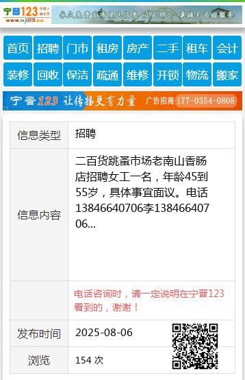 二百货跳蚤市场老南山香肠店招聘女工一名,年龄45到55岁,具体事宜面议。电话13846640706李13846640706 【电话咨询时,请一定说明在伊春信息网看到的,谢谢!】 |