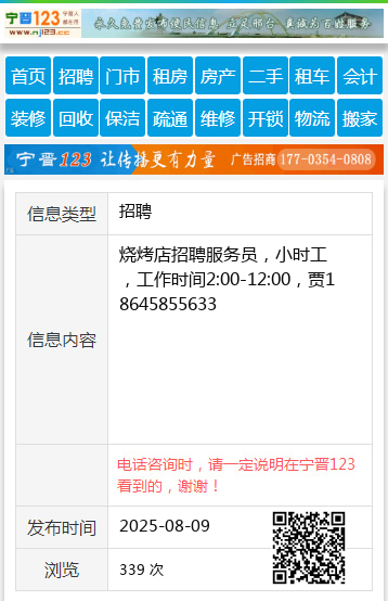 烧烤店招聘服务员,小时工,工作时间2:00-12:00,贾18645855633