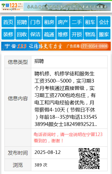 聘机修、机修学徒和服务生工资3500--5000,实习期3个月考核通过直接晋级,实习期工资2700包吃包住,有电工和汽电经验者优先,月带薪假4-10天(节假日不休)年龄18--35岁电话13354538994颜女士18249892521 【电话咨询时,请一定说明在伊春信息网看到的,谢谢!】 |