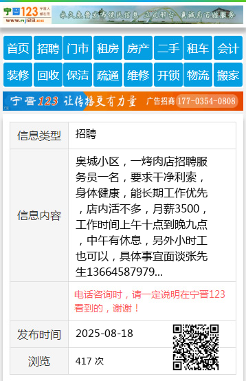 奥城小区,一烤肉店招聘服务员一名,要求干净利索,身体健康,能长期工作优先,店内活不多,月薪3500,工作时间上午十点到晚九点,中午有休息,另外小时工也可以,具体事宜面谈张先生13664587979 【电话咨询时,请一定说明在伊春信息网看到的,谢谢!】 |