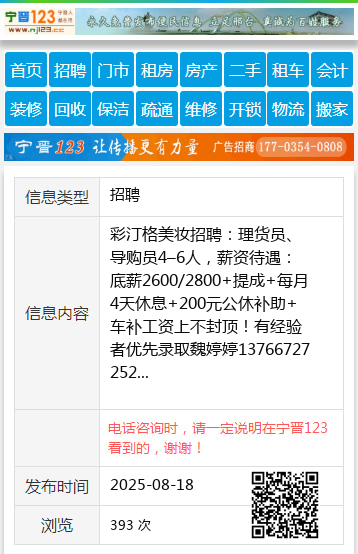 彩汀格美妆招聘:理货员、导购员4–6人,薪资待遇:底薪2600/2800+提成+每月4天休息+200元公休补助+车补工资上不封顶!有经验者优先录取魏婷婷13766727252 【电话咨询时,请一定说明在伊春信息网看到的,谢谢!】 |