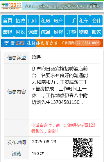 | 防骗提醒: | 伊春信息网(www.yichunba.cn)提醒您:手工活、网络兼职、刷单,都是骗子!凡以各种名义收取费用的都是骗子!找工作是往兜里挣钱,让你往外掏钱的都是骗子!异地招聘请提高警惕,谨防诈骗! |