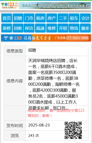 天润华城烧烤店招聘,店长一名,底薪6千➕酒水提成,面案一名底薪3500➕200满勤,凉菜师傅一名,底薪3800➕200满勤,海鲜师傅一名,底薪4200➕300满勤,服务员2名,底薪4500➕满勤300➕酒水提成,以上工作人员要求长期,饭口勿扰盼盼13349388833 【电话咨询时,请一定说明在伊春信息网看到的,谢谢!】 |