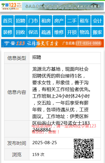 龙源北方基地,现面向社会招聘优秀的前台接待1名,要求女性,形象佳,善于沟通,有相关工作经验者优先。工作班制上24小时休24小时,交五险,一年后享受有薪年假,各项待遇从优,工资面议。工作地址:伊美区新区仙翁山大街2号孟女士18324688845 【电话咨询时,请一定说明在伊春信息网看到的,谢谢!】 |