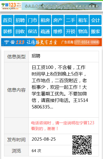 日工资100,不含餐,工作时间早上8点到晚上5点半,工作地点,二百货附近,老板事少,欢迎一起工作!大学生暑期工优先。不要加微信,请直接打电话。王15145806335 【电话咨询时,请一定说明在伊春信息网看到的,谢谢!】 |