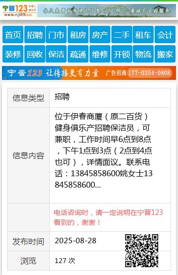位于伊春商厦(原二百货)健身俱乐产招聘保洁员,可兼职,工作时间早6点到8点,下午1点到3点(2点到4点也可),详情面议。联系电话:13845858600姚女士13845858600 【电话咨询时,请一定说明在伊春信息网看到的,谢谢!】 |