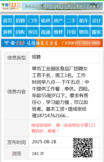 翠峦工业园区食品厂招聘女工若干名,男工1名。工作时间早八点---下午五点;中午提供工作餐,单休。四险。年龄55周岁以下。要求有责任心,学习能力强,可以加班者。基本工资+提成张经理18714762166 【电话咨询时,请一定说明在伊春信息网看到的,谢谢!】 |