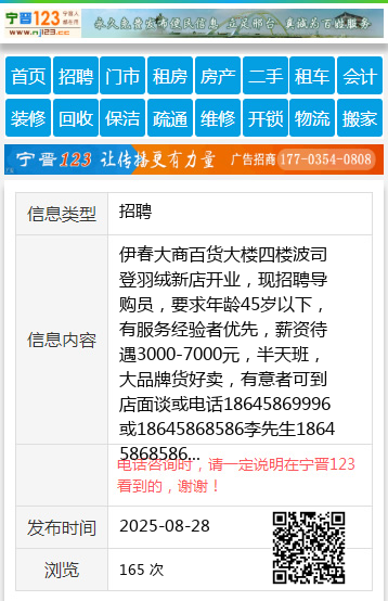 伊春大商百货大楼四楼波司登羽绒新店开业,现招聘导购员,要求年龄45岁以下,有服务经验者优先,薪资待遇3000-7000元,半天班,大品牌货好卖,有意者可到店面谈或电话18645869996或18645868586李先生18645868586 【电话咨询时,请一定说明在伊春信息网看到的,谢谢!】 |
