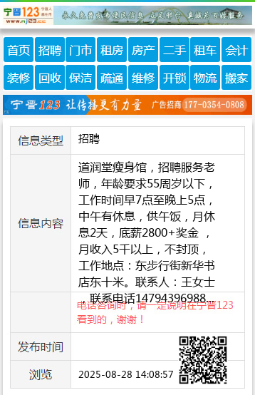 道润堂瘦身馆,招聘服务老师,年龄要求55周岁以下,工作时间早7点至晚上5点,中午有休息,供午饭,月休息2天,底薪2800+奖金 ,月收入5千以上,不封顶,工作地点:东步行街新华书店东十米。联系人:王女士,联系电话14794396988 【电话咨询时,请一定说明在伊春信息网看到的,谢谢!】 |