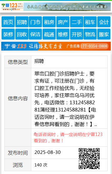 翠峦口腔门诊招聘护士,要求有证,可注册在门诊,有口腔工作经验优先,无经验可培养,家住翠峦乌马河优先,电话微信:13124588281蒲经理13124588281 【电话咨询时,请一定说明在伊春信息网看到的,谢谢!】 |