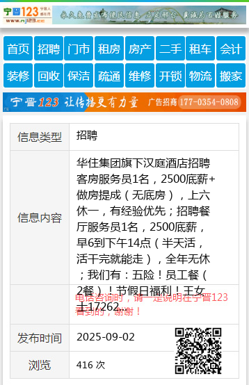 华住集团旗下汉庭酒店招聘客房服务员1名,2500底薪+做房提成(无底房),上六休一,有经验优先;招聘餐厅服务员1名,2500底薪,早6到下午14点(半天活,活干完就能走),全年无休;我们有:五险!员工餐(2餐)!节假日福利!王女士17262590518 【电话咨询时,请一定说明在伊春信息网看到的,谢谢!】 |