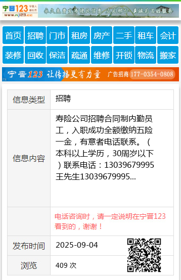 寿险公司招聘合同制内勤员工,入职成功全额缴纳五险一金,有意者电话联系。(本科以上学历,30周岁以下)联系电话:13039679995王先生13039679995 【电话咨询时,请一定说明在伊春信息网看到的,谢谢!】 |