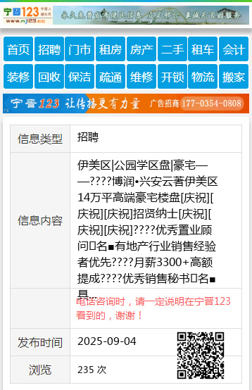 伊美区|公园学区盘|豪宅——????博润•兴安云著伊美区14万平高端豪宅楼盘[庆祝][庆祝][庆祝]招贤纳士[庆祝][庆祝][庆祝]????优秀置业顾问⓯名■有地产行业销售经验者优先????月薪3300+高额提成????优秀销售秘书❶名■具备出纳相关工作经验■熟练操作Office等办公软件????月薪3000+高额提成????优秀前台+水吧❷名■形象良好,气质佳■年龄30岁以下;■身高1.7m及以上????月薪4000????优秀信贷专员❶名■具备丰富的信贷相关工作经验■较强的风险意识和客户服务意识????月薪3500+高额提成????优秀前台+水吧❷名■形象良好,气质佳■年龄30岁以下;■身高1.7m及以上????月薪4000????优秀保安名■退役军人优先考虑■年龄30岁以下■身高在1.78m-1.82m之间????月薪3500经理18904584588 |
