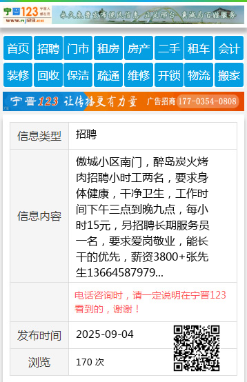 傲城小区南门,醉岛炭火烤肉招聘小时工两名,要求身体健康,干净卫生,工作时间下午三点到晚九点,每小时15元,另招聘长期服务员一名,要求爱岗敬业,能长干的优先,薪资3800+张先生13664587979 【电话咨询时,请一定说明在伊春信息网看到的,谢谢!】 |