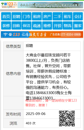 大商金尔曼招珠宝顾问若干3800以上/月,负责门店销售。社保,晋升空间,带薪培训,带薪休假应聘标准:有销售经验优先,公司给予平台,提供学习机会,有较强的沟通能力,有责任心。电话13846633003梅女士梅蕾13846633003 【电话咨询时,请一定说明在伊春信息网看到的,谢谢!】 |