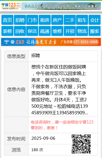 想找个在新区住的做饭阿姨,中午做完饭可以回家晚上再来,做3口人午饭晚饭。不做家务,不洗衣服,只负责厨房餐厅卫生,要求干净做饭好吃。月休4天,工资2500元地址~松韵城电话13945893909王13945893909 【电话咨询时,请一定说明在伊春信息网看到的,谢谢!】 |