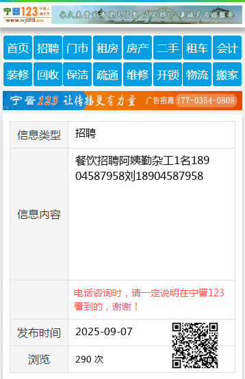 餐饮招聘阿姨勤杂工1名18904587958刘18904587958