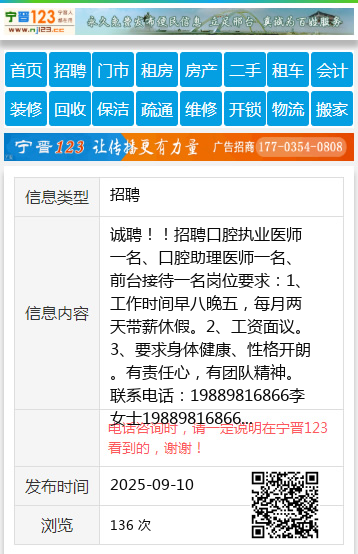 诚聘!!招聘口腔执业医师一名、口腔助理医师一名、前台接待一名岗位要求:1、工作时间早八晚五,每月两天带薪休假。2、工资面议。3、要求身体健康、性格开朗。有责任心,有团队精神。联系电话:19889816866李女士19889816866 【电话咨询时,请一定说明在伊春信息网看到的,谢谢!】 |