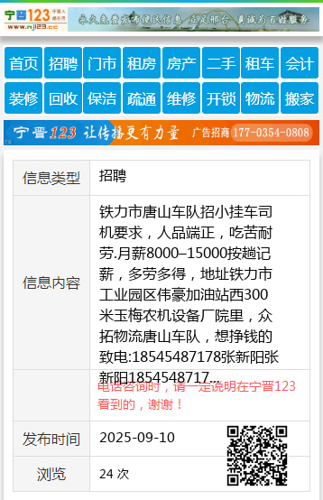 铁力市唐山车队招小挂车司机要求,人品端正,吃苦耐劳.月薪8000–15000按趟记薪,多劳多得,地址铁力市工业园区伟豪加油站西300米玉梅农机设备厂院里,众拓物流唐山车队,想挣钱的致电:18545487178张新阳张新阳18545487178 【电话咨询时,请一定说明在伊春信息网看到的,谢谢!】 |