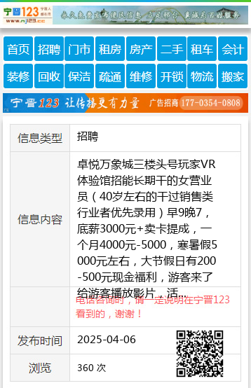 卓悦万象城三楼头号玩家VR体验馆招能长期干的女营业员(40岁左右的干过销售类行业者优先录用)早9晚7,底薪3000元+卖卡提成,一个月4000元-5000,寒暑假5000元左右,大节假日有200-500元现金福利,游客来了给游客播放影片,活不累平时不忙可座着休息.每月一天工休另招长期的周末和节假日兼职(80元一天)长期干的有提成,加上提成一天100元左右招女假期工2100底薪+卖卡2%提成每个月2500元左右杨先生18804644777 【电话咨询时,请一定说明在伊春信息网看到的,谢谢!】 |