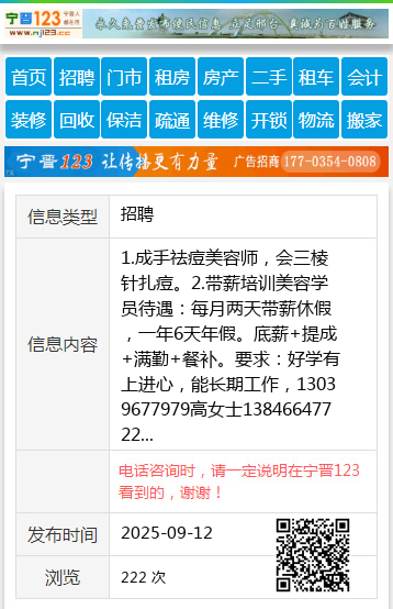 1.成手祛痘美容师,会三棱针扎痘。2.带薪培训美容学员待遇:每月两天带薪休假,一年6天年假。底薪+提成+满勤+餐补。要求:好学有上进心,能长期工作,13039677979高女士13846647722 【电话咨询时,请一定说明在伊春信息网看到的,谢谢!】 |