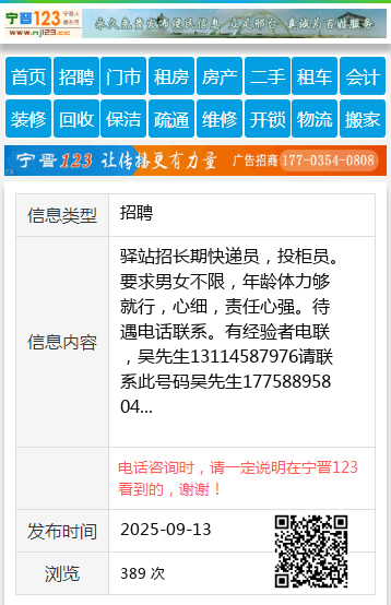 驿站招长期快递员,投柜员。要求男女不限,年龄体力够就行,心细,责任心强。待遇电话联系。有经验者电联,吴先生13114587976请联系此号码吴先生17758895804 【电话咨询时,请一定说明在伊春信息网看到的,谢谢!】 |