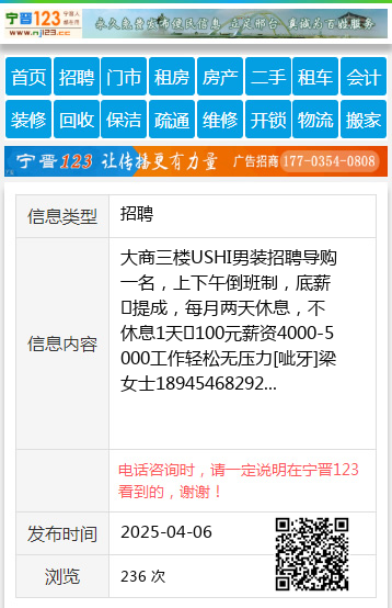 大商三楼USHI男装招聘导购一名,上下午倒班制,底薪➕提成,每月两天休息,不休息1天➕100元薪资4000-5000工作轻松无压力[呲牙]梁女士18945468292 【电话咨询时,请一定说明在伊春信息网看到的,谢谢!】 |
