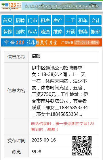 伊市区通讯公司招聘要求:女:18-38岁之间,上一天一宿,休两天两宿,活少不累,休息时间充足,五险,工资2750元,工作地址:伊春市南环铁塔公司,有意者联系:邢女士18845853334,邢女士18845853334 【电话咨询时,请一定说明在伊春信息网看到的,谢谢!】 |