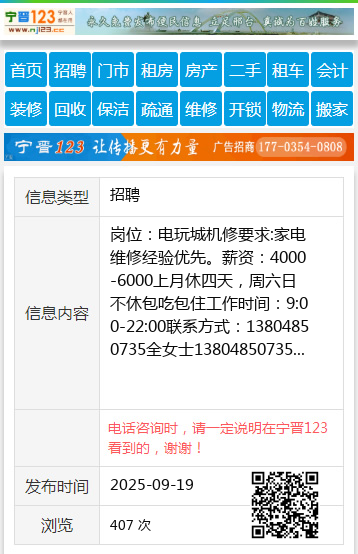 岗位:电玩城机修要求:家电维修经验优先。薪资:4000-6000上月休四天,周六日不休包吃包住工作时间:9:00-22:00联系方式:13804850735全女士13804850735 【电话咨询时,请一定说明在伊春信息网看到的,谢谢!】 |