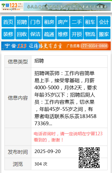 招聘调茶师:工作内容简单易上手,接受零基础,月薪4000-5000,月休2天,要求年龄35岁以下;招聘后厨人员:工作内容煮茶,切水果,年龄45岁-55岁之间,有意者电话联系乐乐茶18345873369 【电话咨询时,请一定说明在伊春信息网看到的,谢谢!】 |
